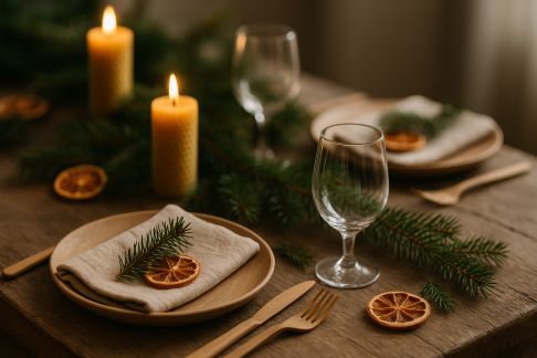 - Guirlandes maison : Enfiler des perles, des rondelles d’orange séchée, ou des formes découpées dans du carton, accrocher autour du centre de table.